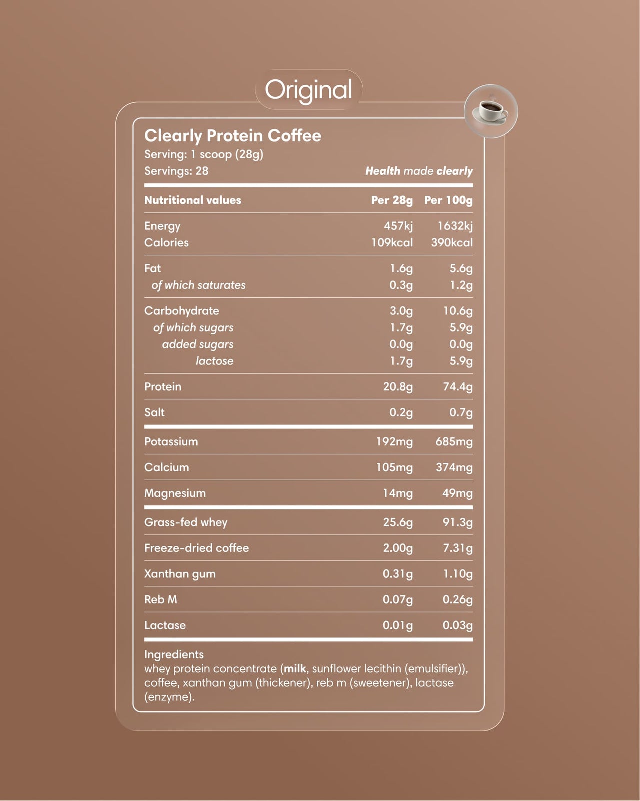 Nasza Kawa Mrożona Proteinowa łączy 100% kawy arabica z Kolumbii z whey karmionym trawą z Nowej Zelandii. Kawa jest liofilizowana, aby zachować smak, a whey pochodzi od krów, które spędzają na pastwisku co najmniej 350 dni w roku. Czysta alternatywa z 21g białka i 35-45mg kofeiny.