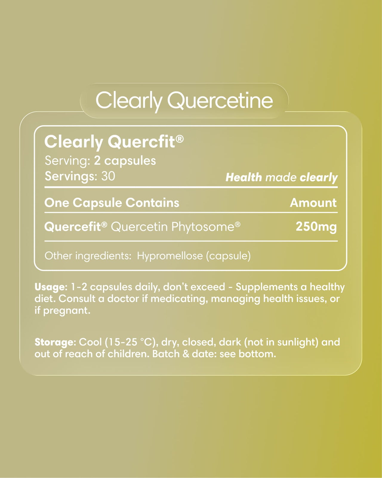 Przyjmować codziennie 1–2 kapsułki popijając wodą, najlepiej w trakcie lub po posiłku. Kwercetyna rozpuszcza się w tłuszczach, dlatego posiłek pomaga organizmowi ją lepiej wchłonąć.