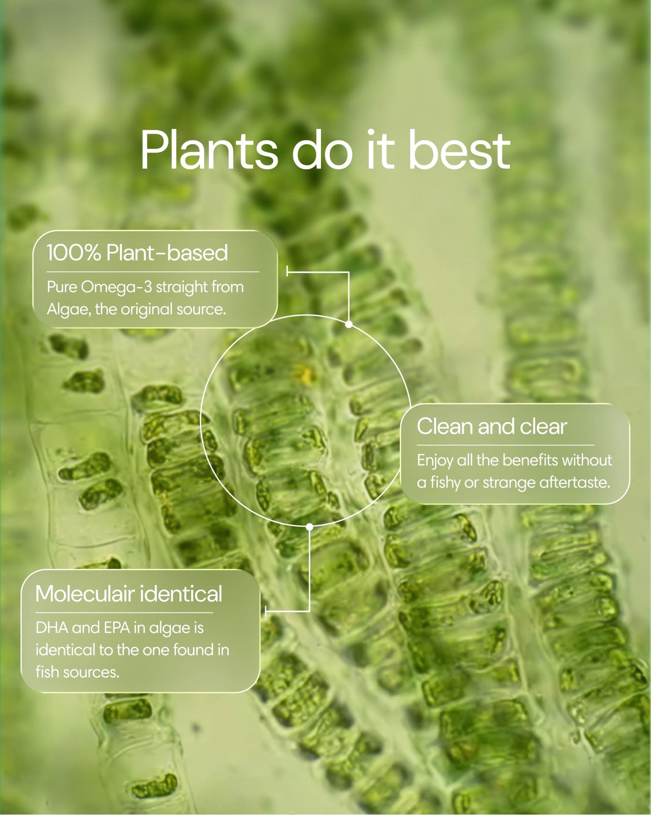Algi to oryginalne źródło kwasów tłuszczowych omega-3, w tym DHA i EPA. Sięgając bezpośrednio do źródła, omijamy ryby, dzięki czemu produkt jest w 100% roślinny i bardziej zrównoważony. Unikamy też typowych wad oleju rybiego, takich jak rybi posmak czy obawy związane z przełowieniem.